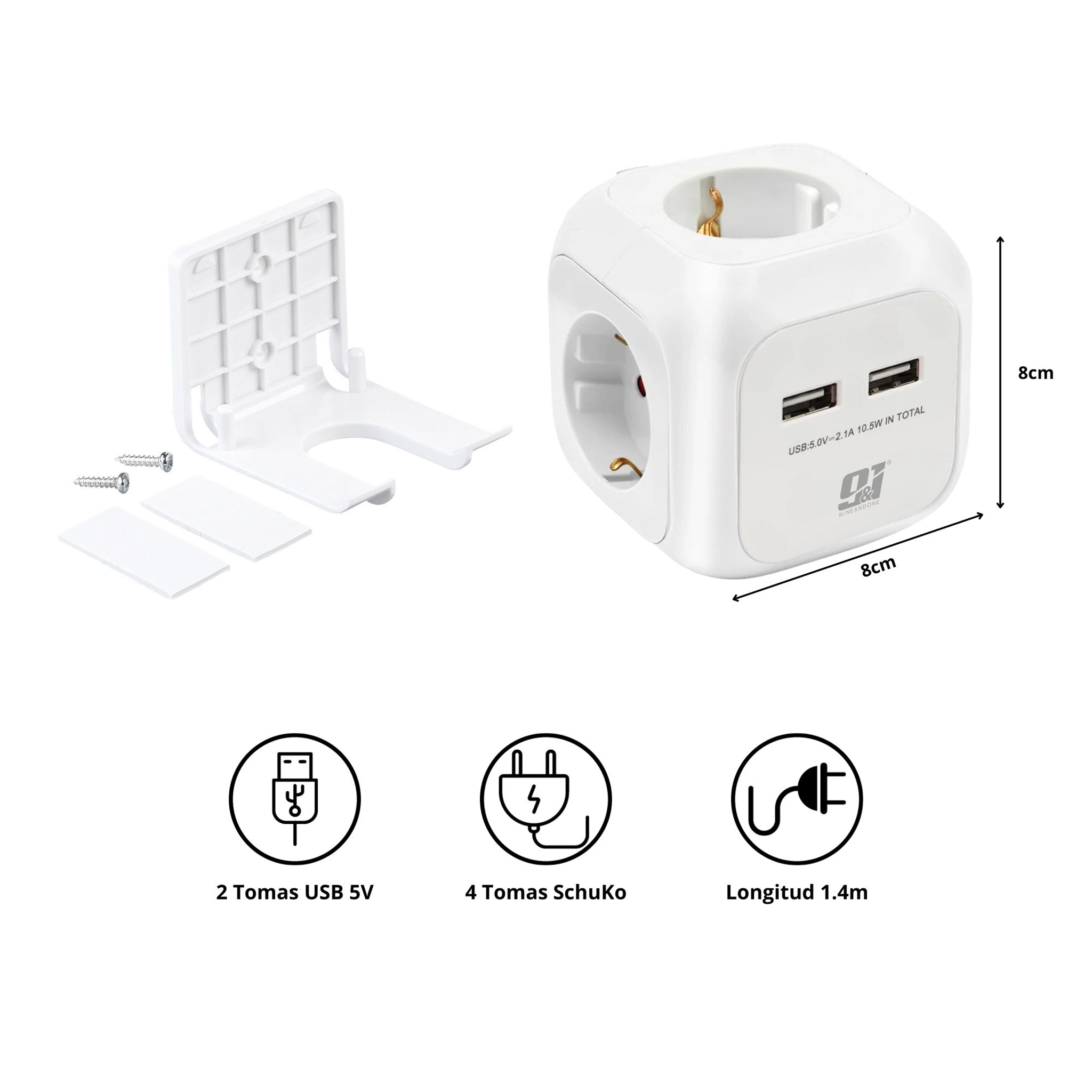 La base o regleta con forma de cubo dispone de 4 tomas tipo F, SCHUKO, y 2 tomas USB. Tiene un cable de 1,4 metros de longitud y se suministra con soporte para fijar a la pared.