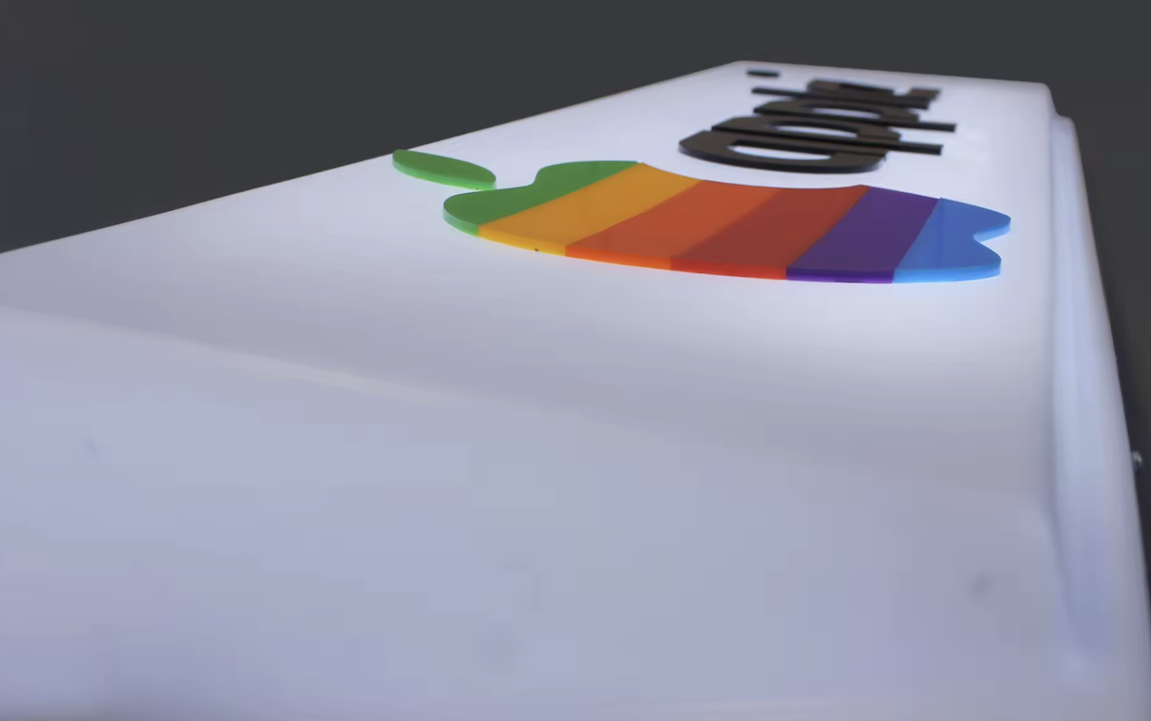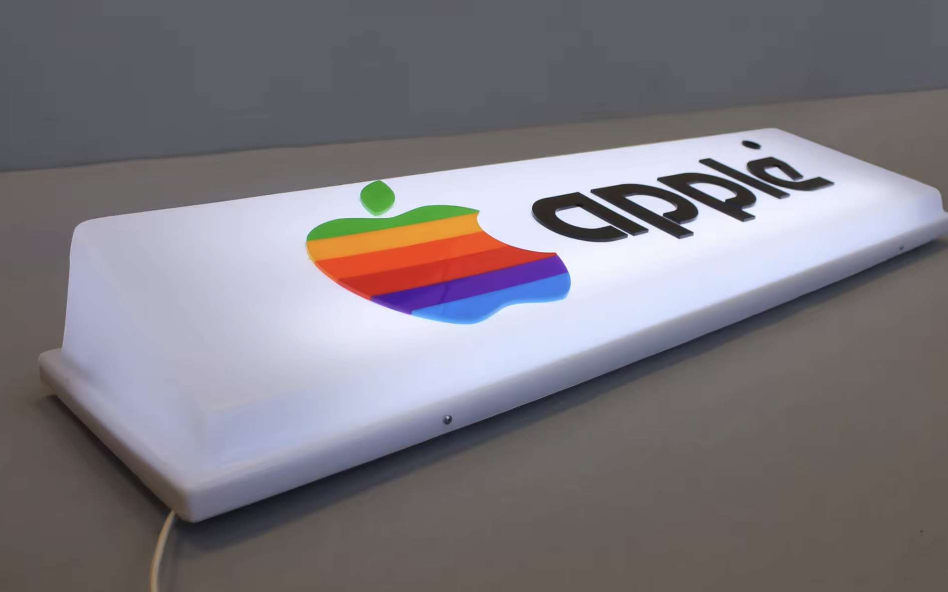 IMPORTADO DE EEUU. Letrero luminoso Apple vintage blanco. Cartel luminoso de la compañía Apple con el logotipo antiguo. Realizado en metacrilato y aluminio, este cartel queda genial en cualquier parte de tu hogar u oficina. Una pieza decorativa muy original que da un toque retro a la estancia sin renunciar a la elegancia y todos los valores asociados a la compañía de la manzana.